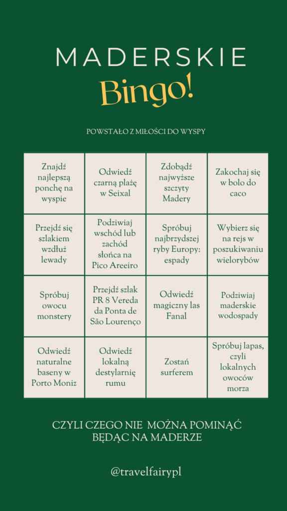 Przed Wami Maderskie Bingo! Znajdziecie tam najciekawsze miejscówki, szlaki i atrakcje wyspy oraz kilka najpopularniejszych lokalnych przysmaków, których aż grzech nie spróbować 😉